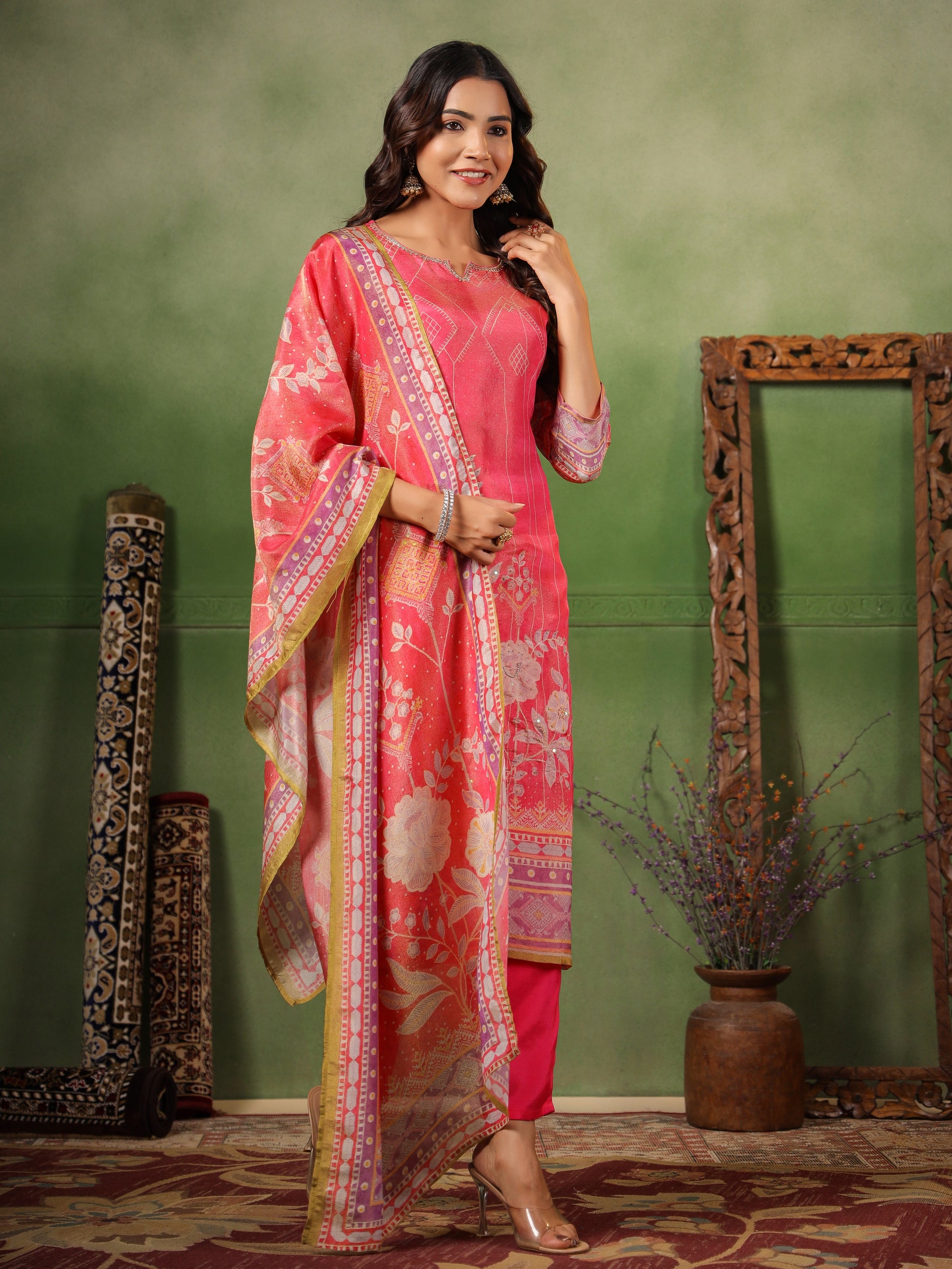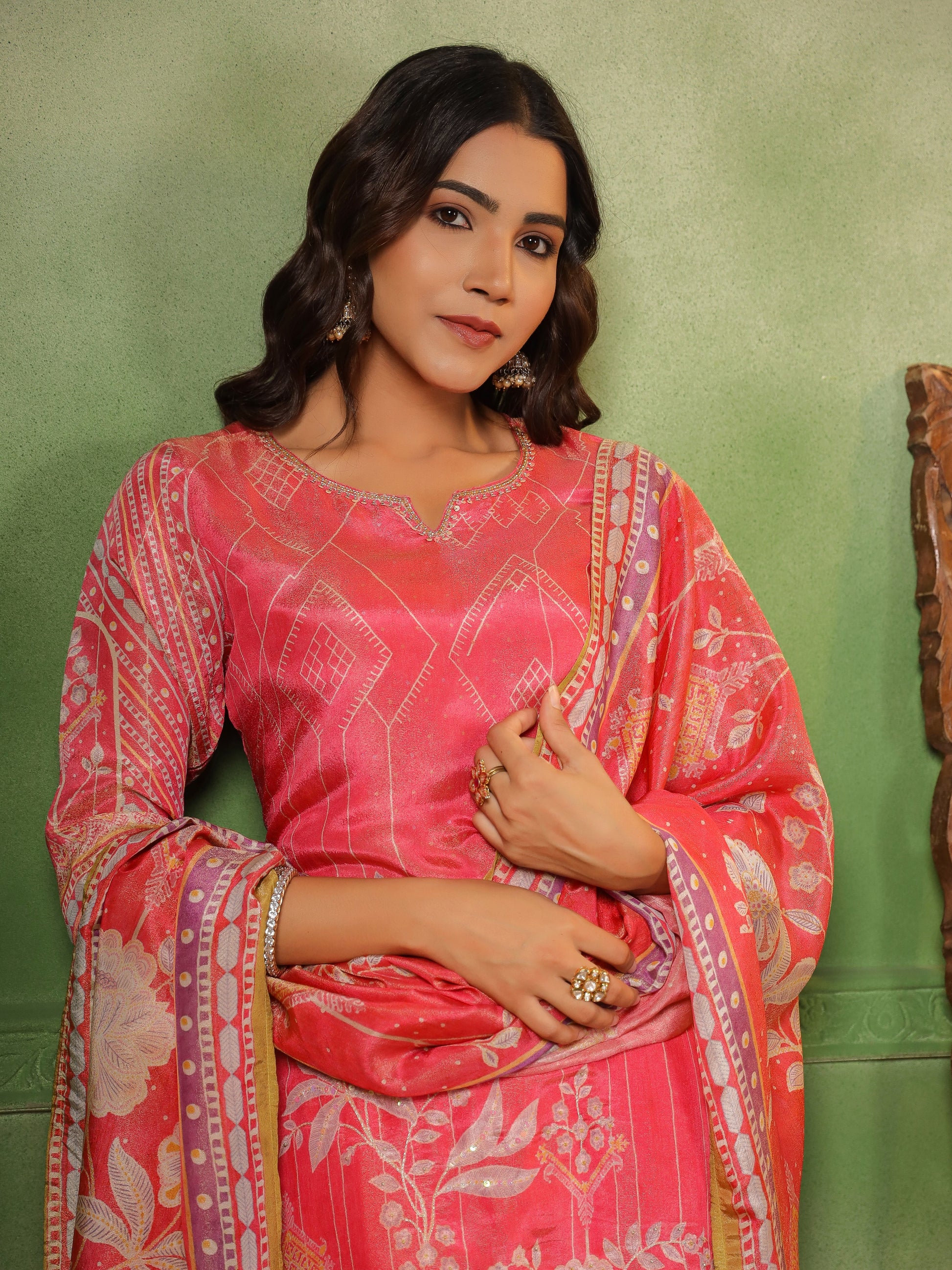 Add a pop of color to your wardrobe with this vibrant pink ensemble, blending classic patterns with modern sophistication