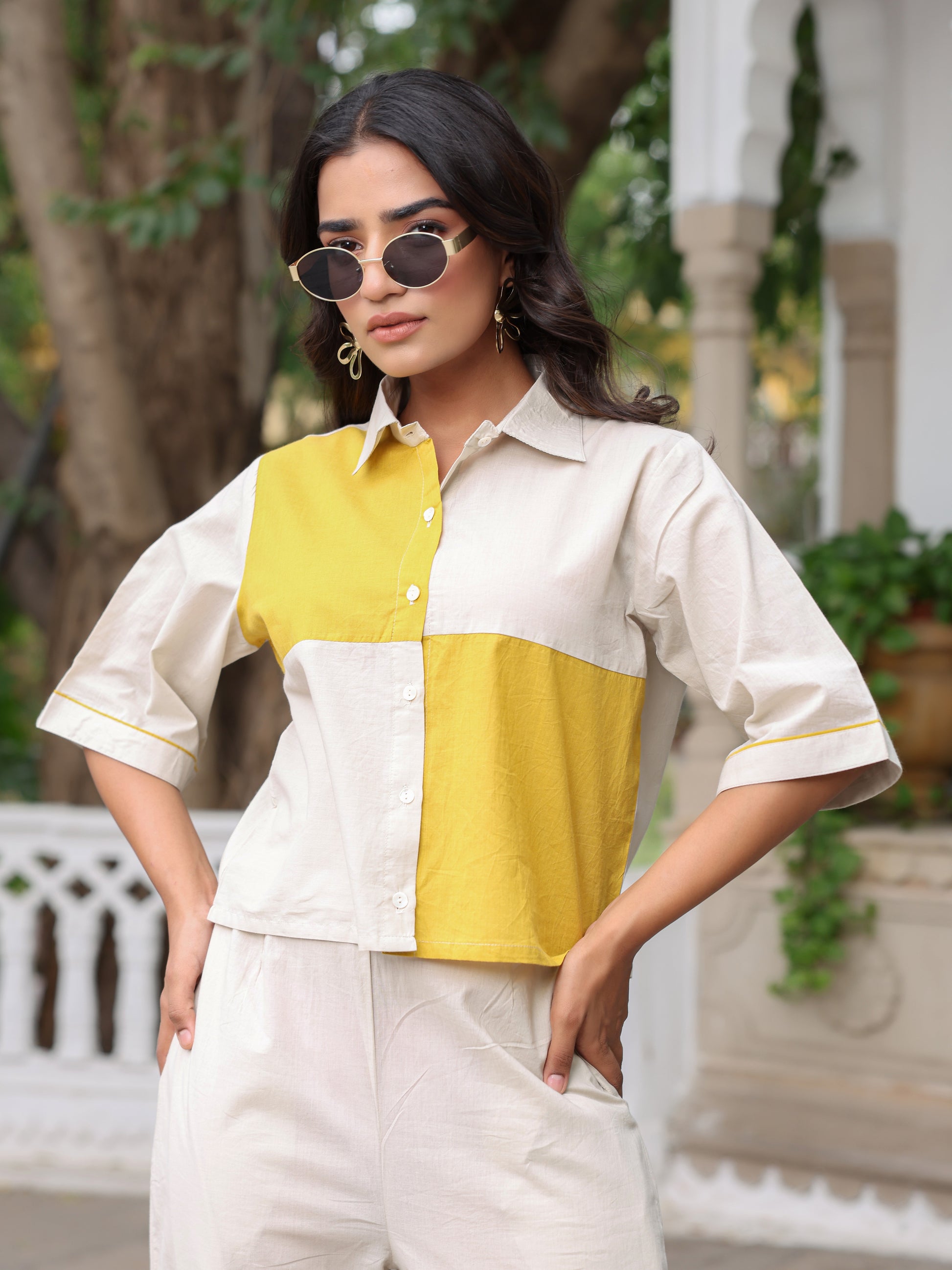 The perfect mix of smart and casual, this yellow & beige co-ord set redefines wardrobe basics featuring a dual-tone shirt and relaxed cotton pants with side pockets.