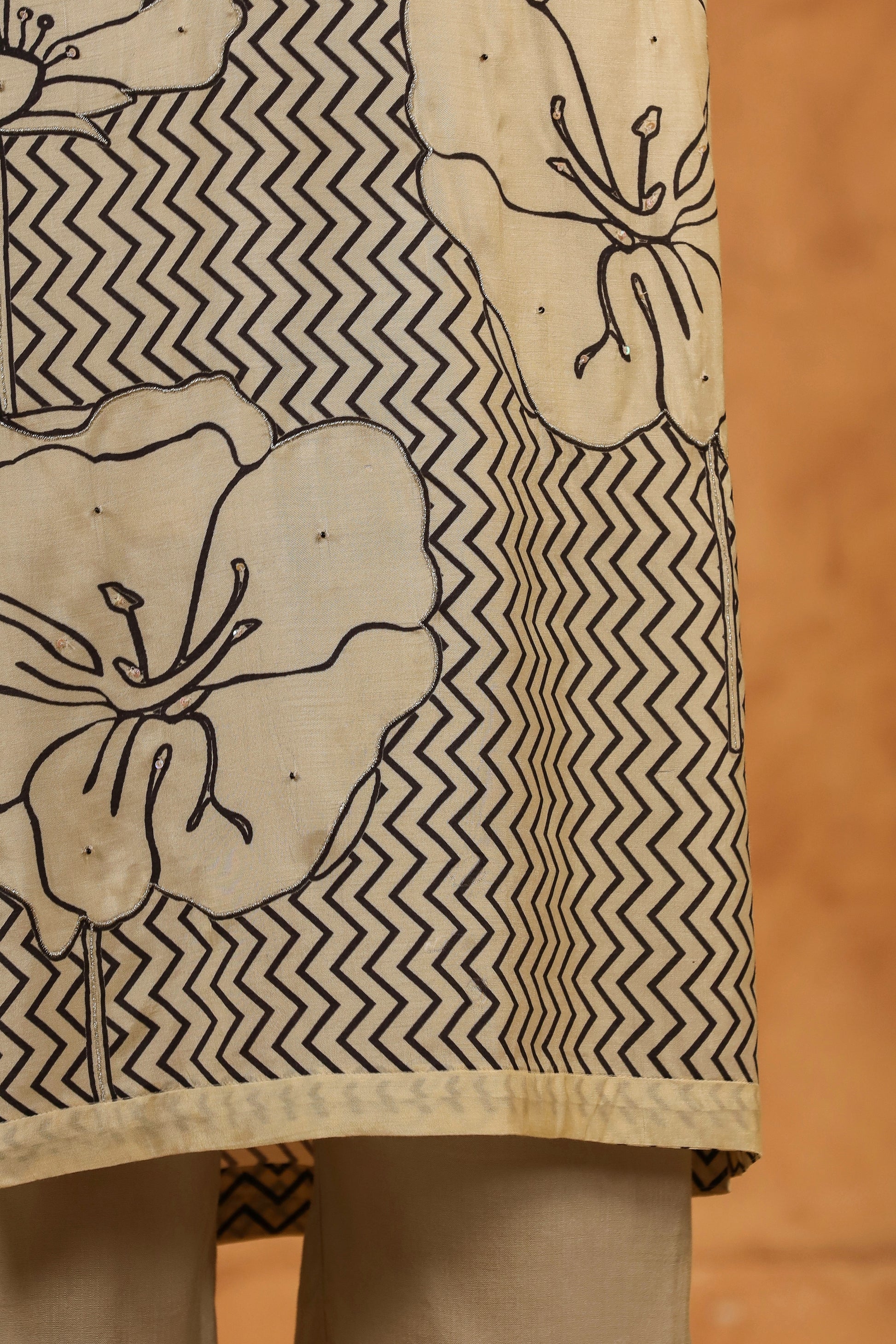 This beautifully crafted cream and black suit set is adorned with bold floral designs and intricate zigzag patterns. The V-neck kurta pairs seamlessly with beige trousers and a statement black dupatta, making it a graceful choice for festive or formal gatherings.
