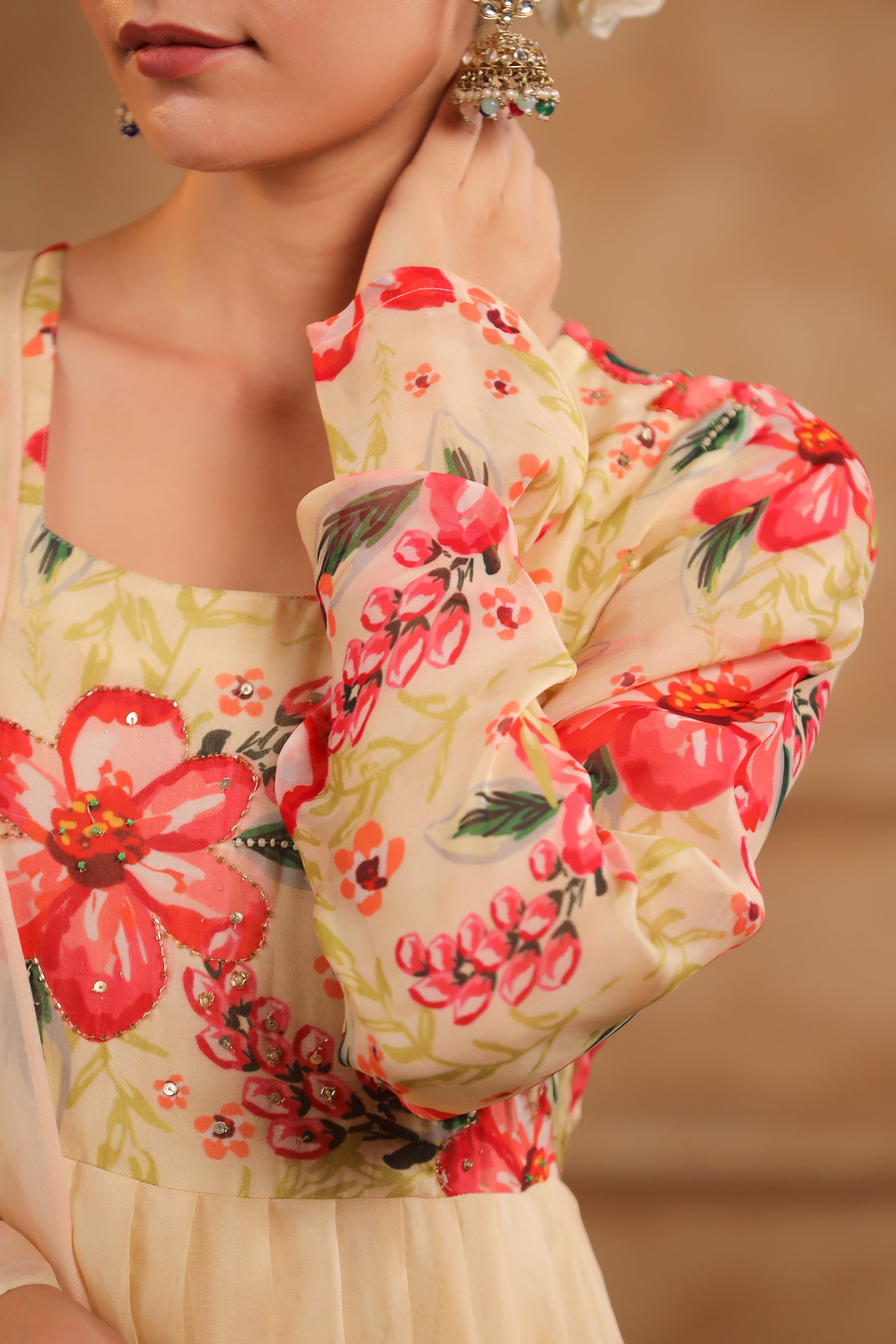 Feel the celebration in every swirl! The delightful mix of beautiful beige and vivid cream floral prints are as lively and elegant as you are.