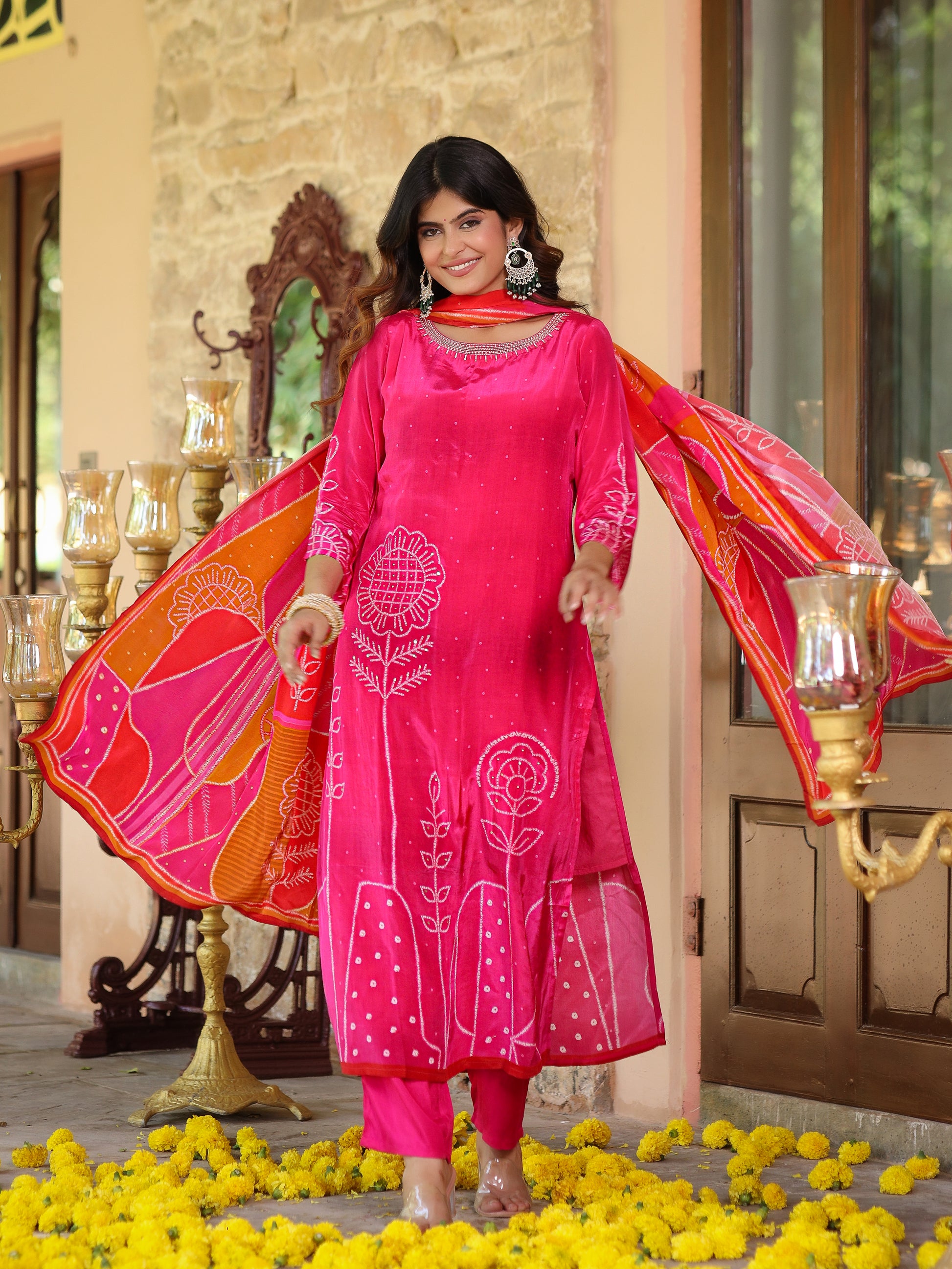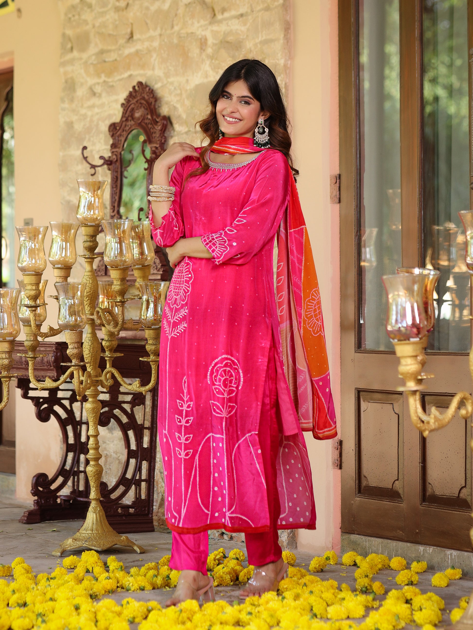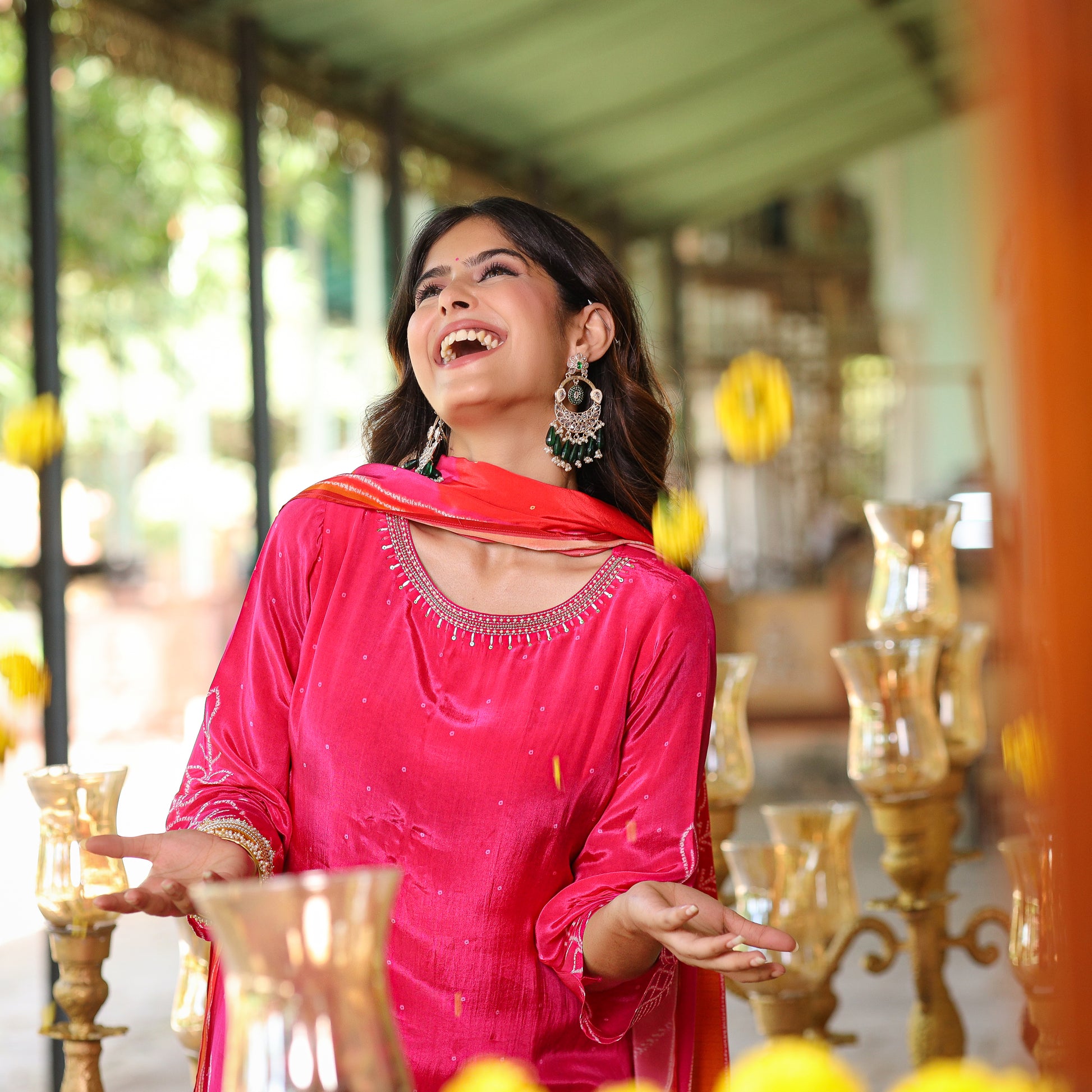 Dive into the festive spirit with this lively pink suit set. The beautiful printed kurta with a bright dupatta, featuring playful designs and vibrant hues, is perfect for making your ethnic look pop at all celebrations and parties.