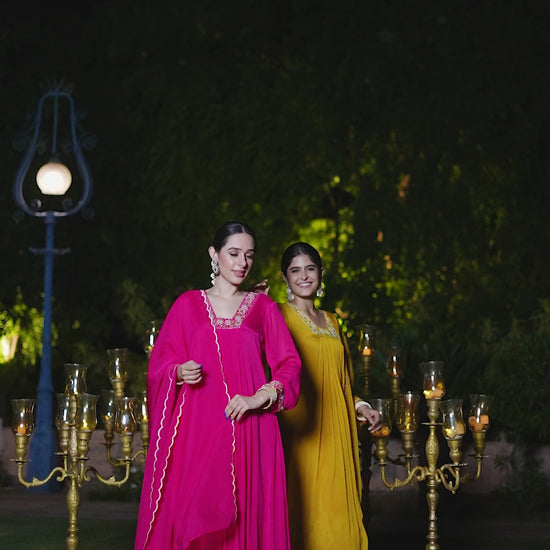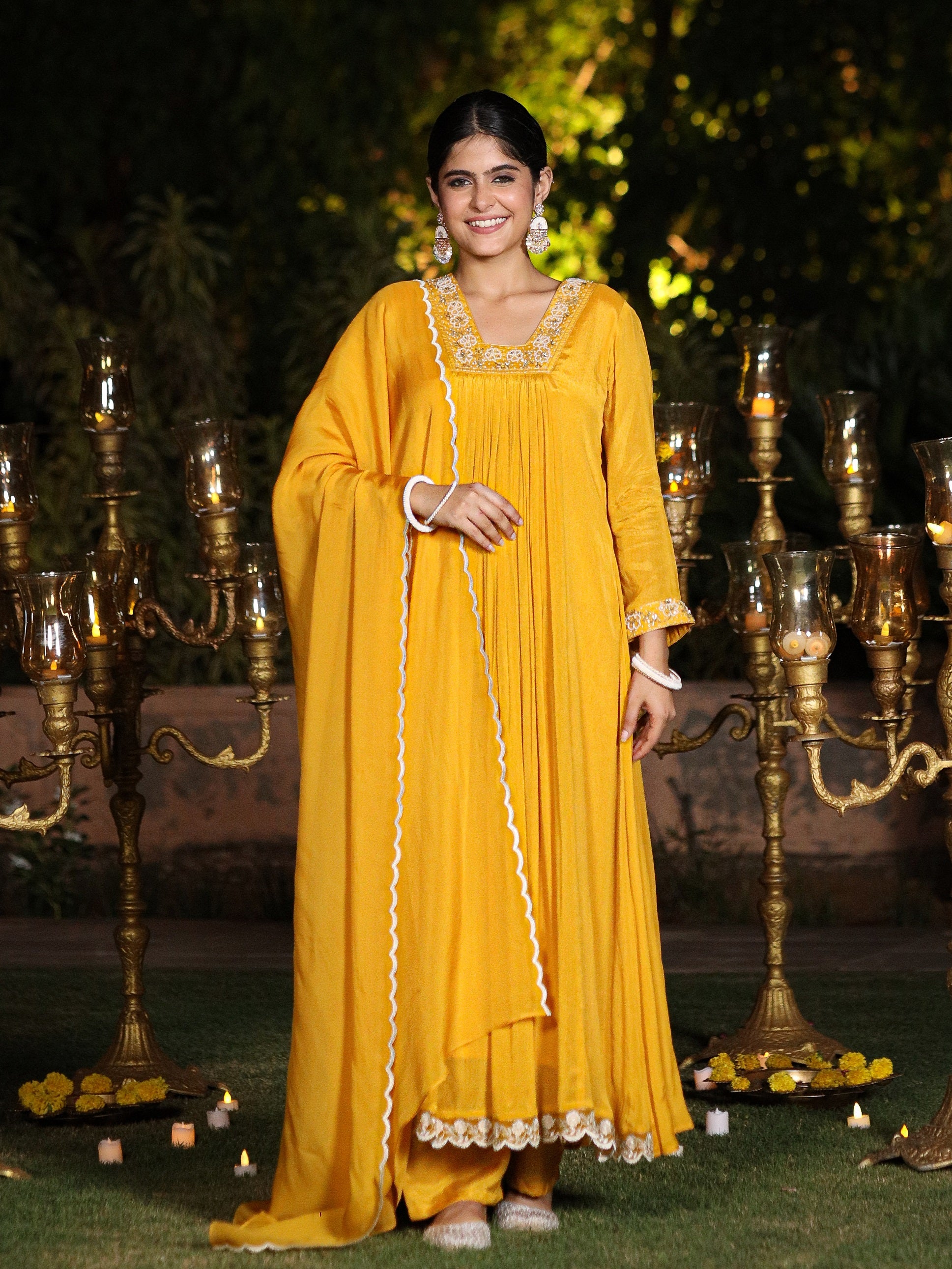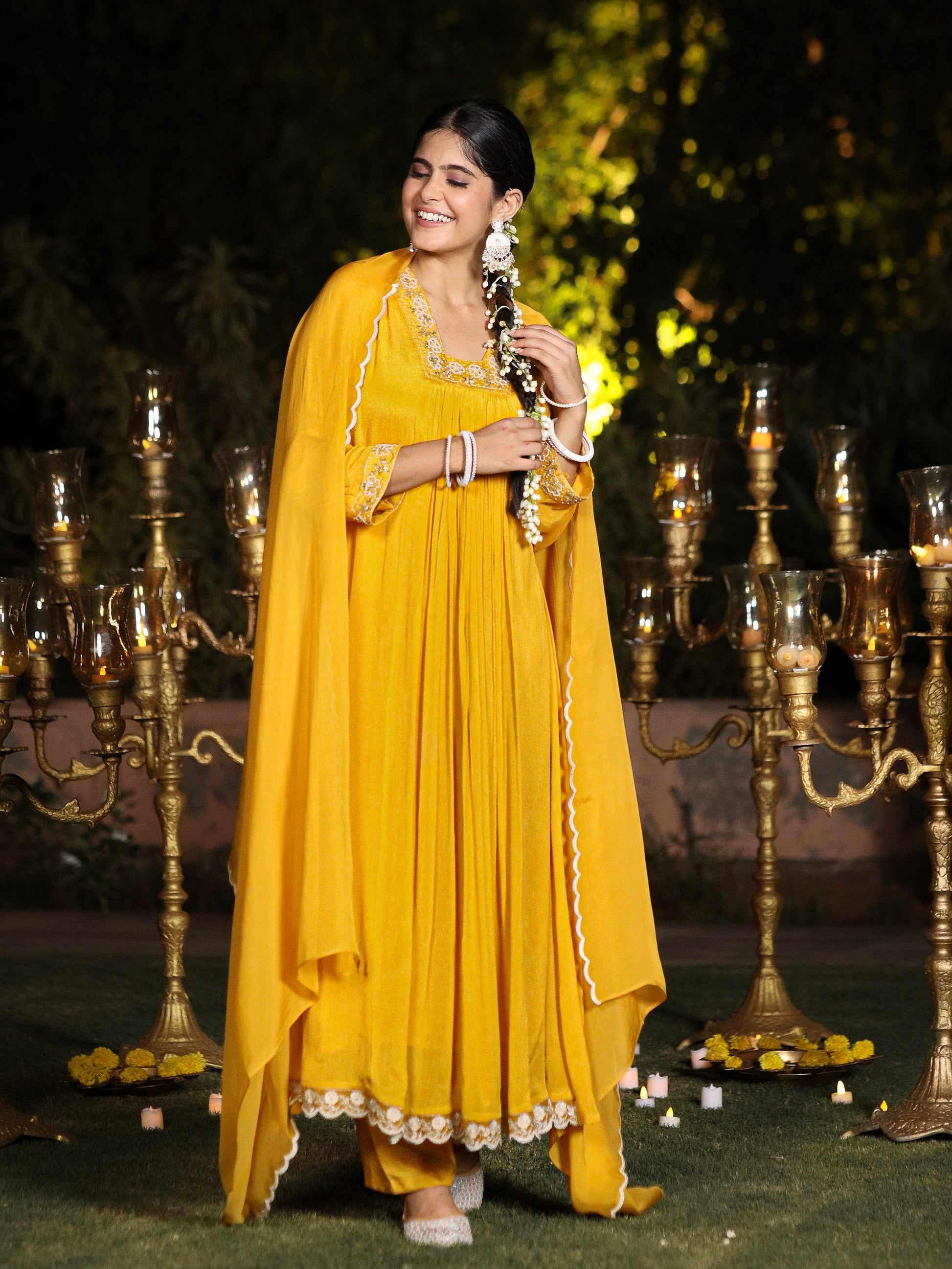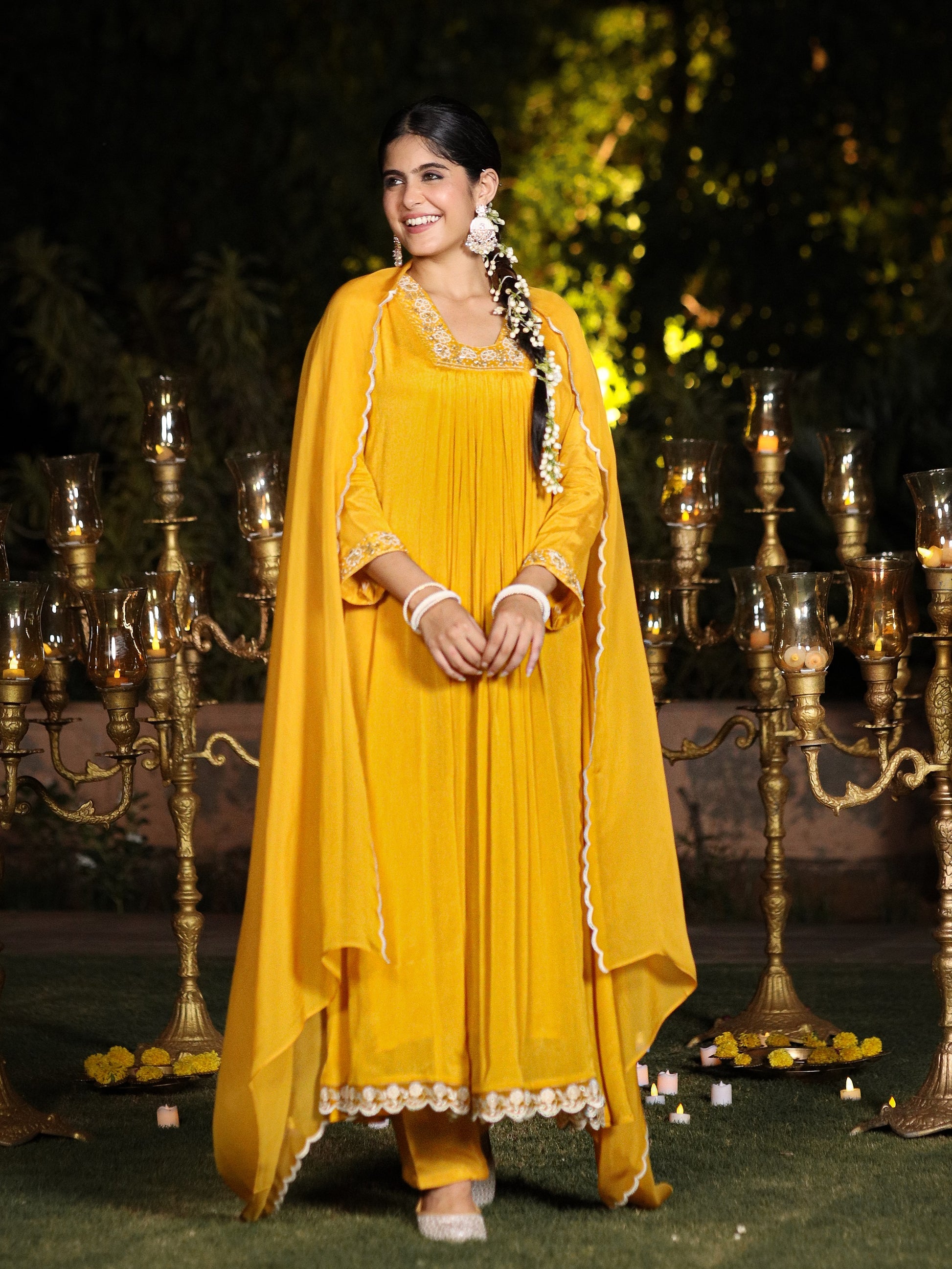 Turn heads this festive season with this glowing gold-yellow ensemble. Adorned with delicate embroidery and scalloped borders, this outfit reflects a perfect blend of chic and contemporary aesthetics.