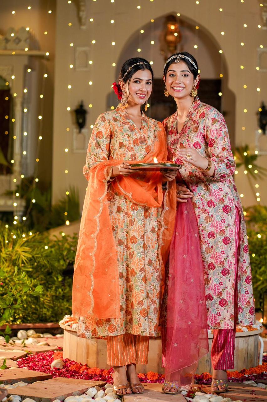 Upgrade your look with this beautiful Pink tulip Straight suit set, which combines style and comfort made from soft chanderifabric, the kurta has a V-neckline with delicate beads and sequin work, flowing sleeves and it comes with straight pants and a scallop organza sequin dupatta. This outfit is ideal for any event, offering both elegance and versatility.