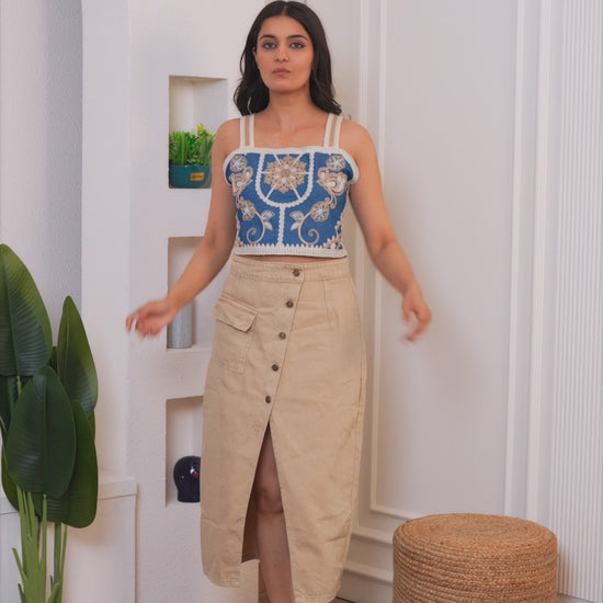 This orange embroidered co-ord set is crafted to make you stand out with scalloped hems and breezy wide-leg trousers with a crop top. It’s an ideal pick for holidays and brunch dates.