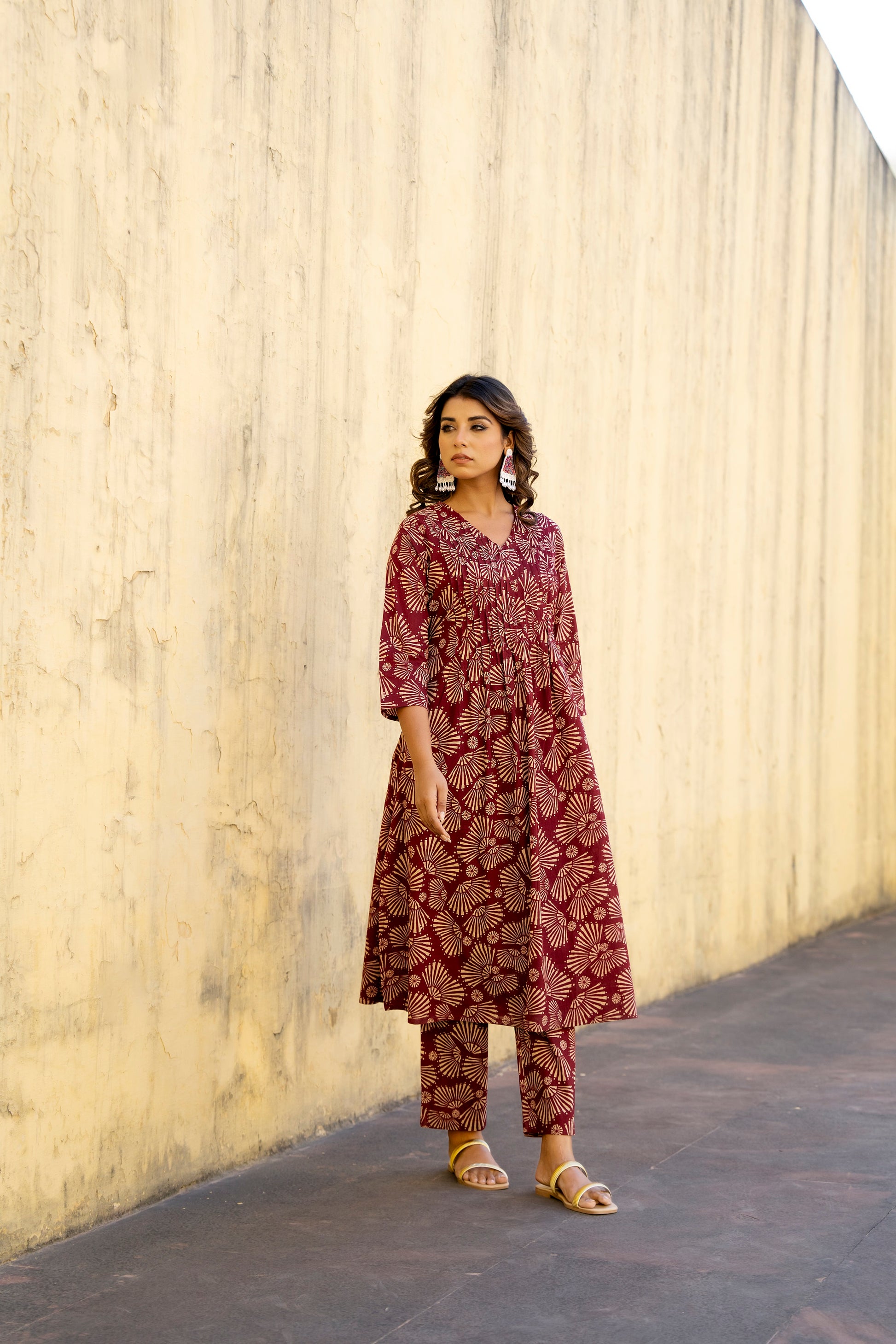 Crafted in breathable cotton this maroon kurta set comes alive with beige botanical-inspired prints. The straight silhouette side slits and matching pants make it an elegant yet versatile choice for office wear, brunch or evening gatherings.