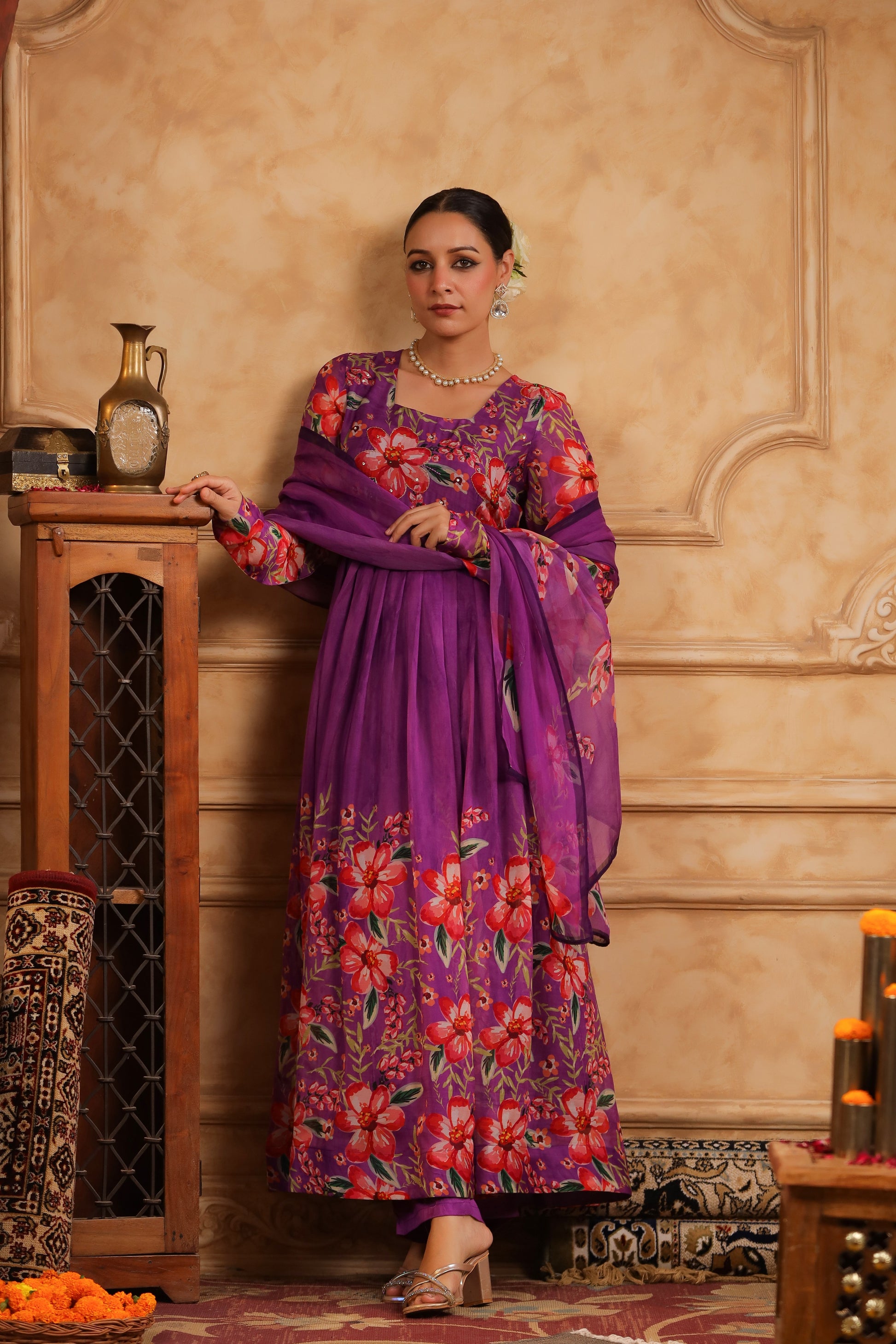 Feel the celebration in every swirl! The delightful mix of beautiful beige and vivid purple floral prints are as lively and elegant as you are.