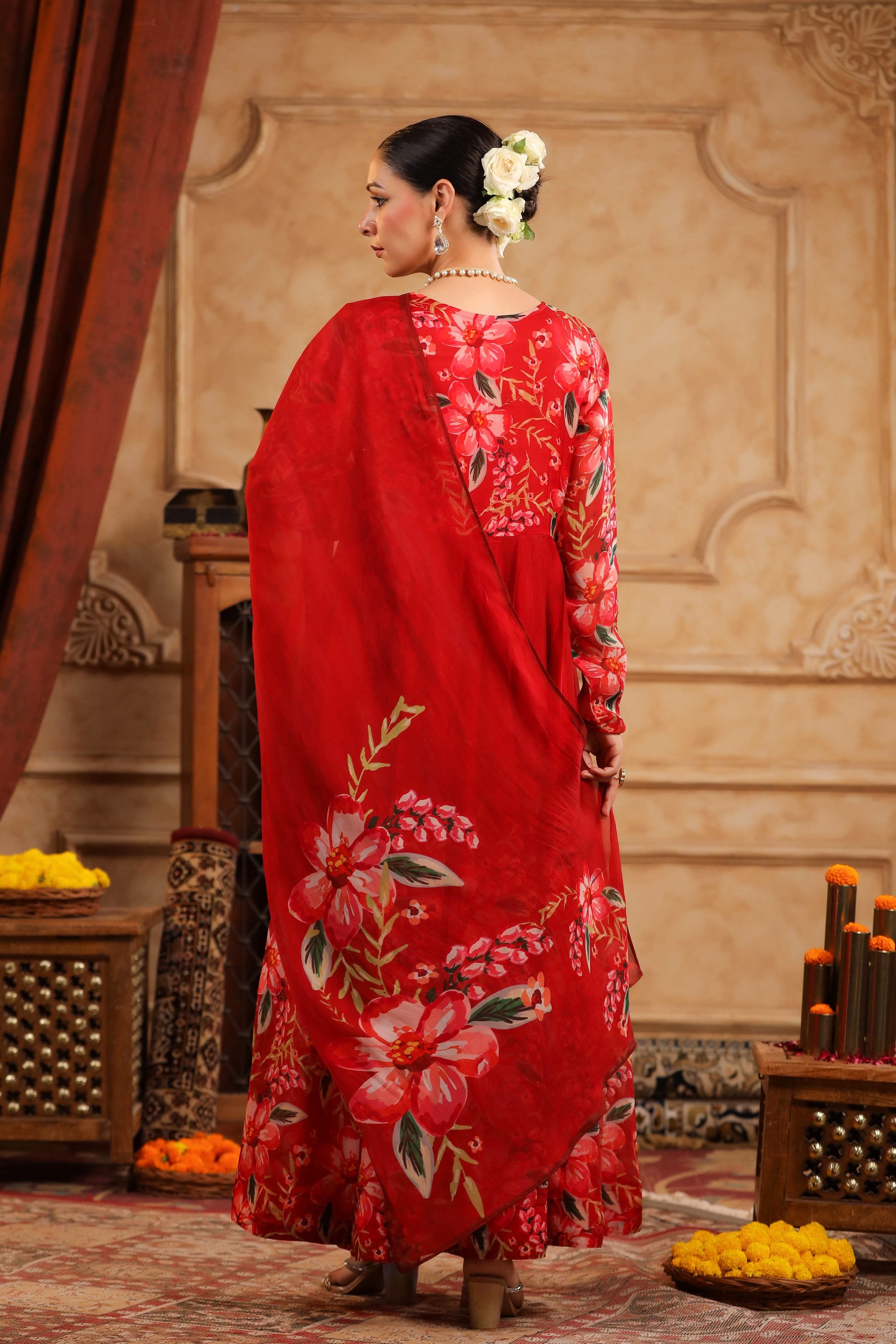 Feel the celebration in every swirl! The delightful mix of beautiful beige and vivid red floral prints are as lively and elegant as you are.
